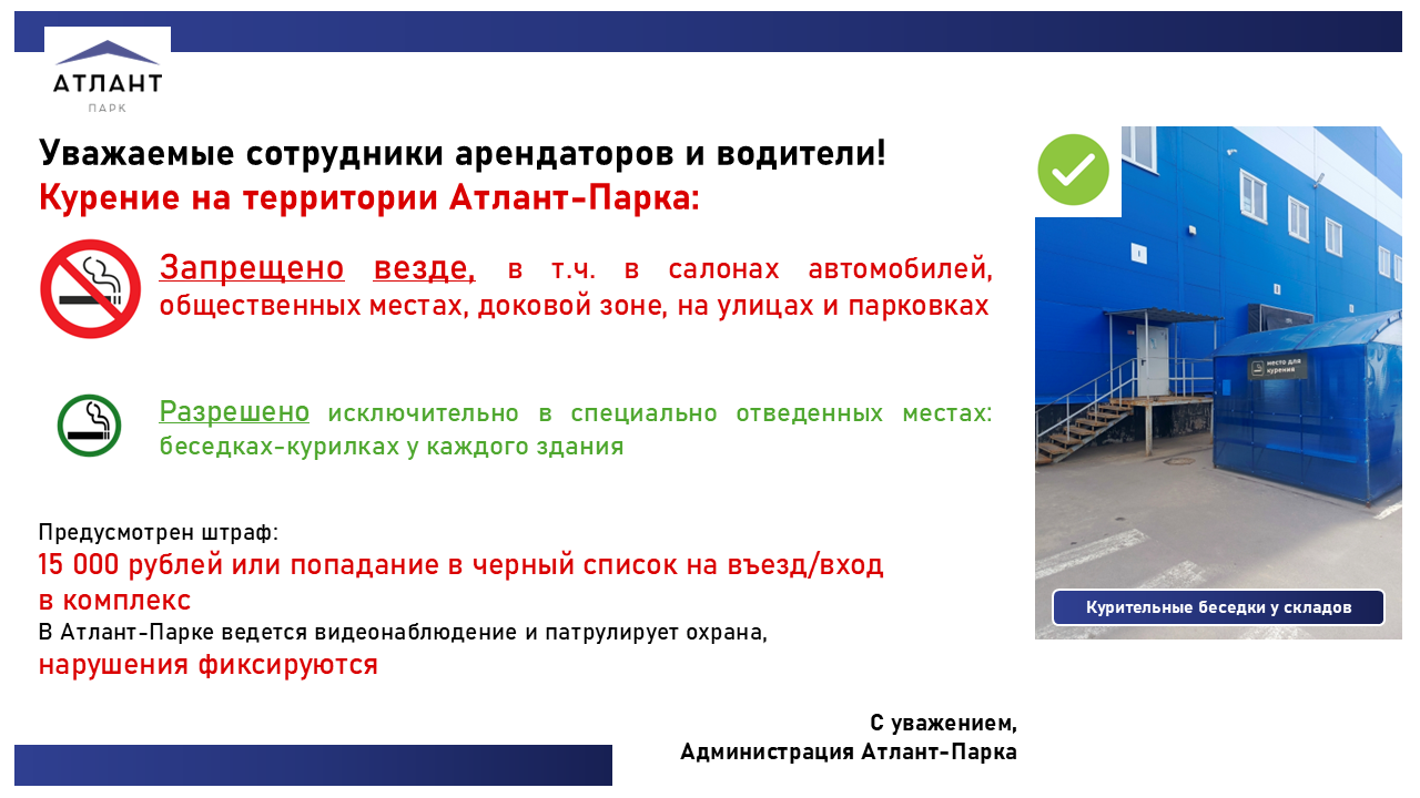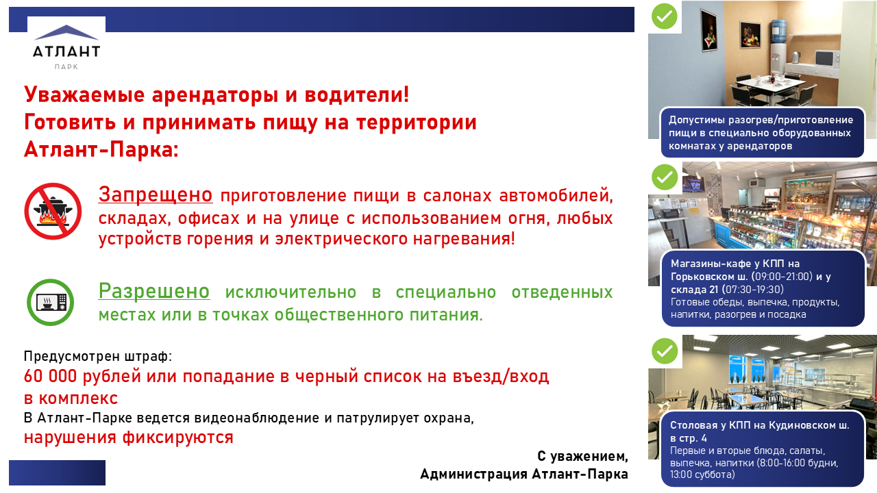 На территории Атлант-Парка действуют Правила пользования объектами недвижимости. За их несоблюдение применяются меры ответственности, в т.ч. финансовые